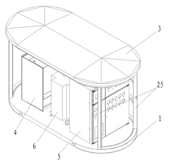 箱體外殼由材料層、龍骨與防護(hù)鋼板層三層組成,可以較好地對(duì)變電站內(nèi)的用電設(shè)備進(jìn)行較好地保護(hù);箱體外殼為橢圓柱狀,結(jié)構(gòu)更加緊密牢固。箱體外殼的前表面設(shè)置有雙開(kāi)門(mén),箱體外殼的表面均勻地設(shè)置有電纜線孔且所述電纜線孔內(nèi)貫穿有電纜線。與周圍的環(huán)境相適應(yīng),同時(shí)也提高了變電站的通風(fēng)散熱的效率。