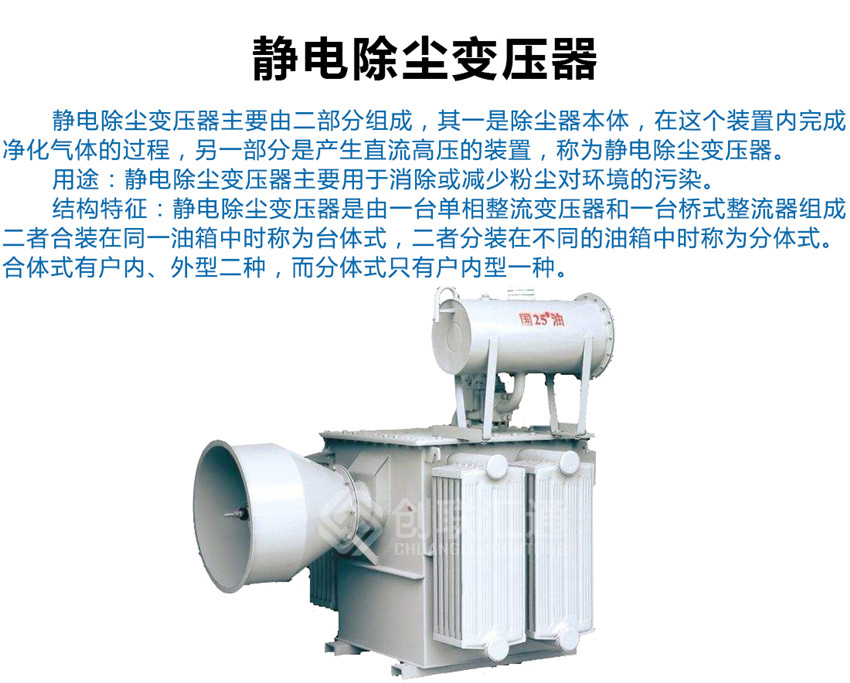 靜電除塵變壓器適合于工業(yè)部門(mén)的除塵、除霧、脫水、雜質(zhì)分離和回收稀有金屬及其他原料等方面應(yīng)用。